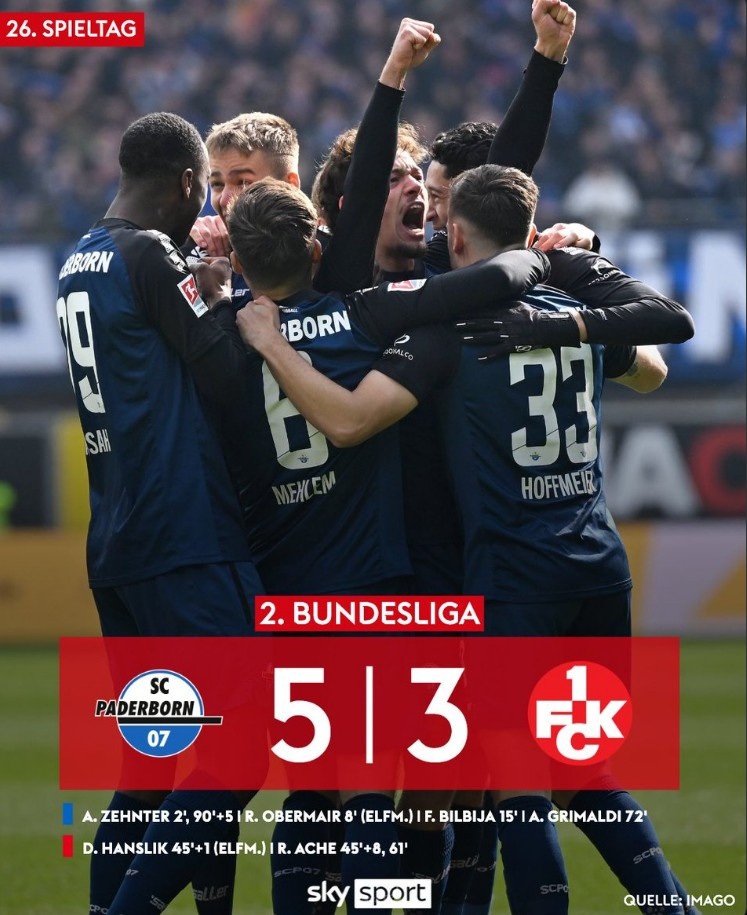 3月15日訊 在德乙第26輪一場強強較量中,帕德博恩5-3擊敗凱澤斯勞滕。