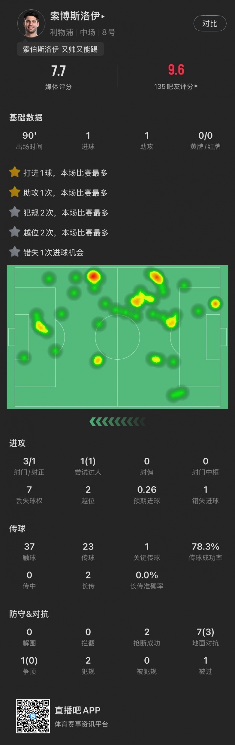 2月24日訊 在剛剛結(jié)束的英超本輪焦點(diǎn)戰(zhàn)中,利物浦2-0擊敗曼城。本場比賽,索博斯洛伊傳射建功,獲評7.7分。