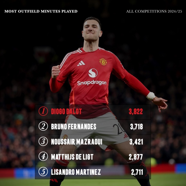 本賽季曼聯(lián)非門將出場時間榜:達(dá)洛特壓B費(fèi)居首,馬茲拉維在列