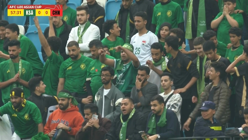 看臺沙特球迷目睹主裁判給中國隊點球,比劃手抗議示意看VAR