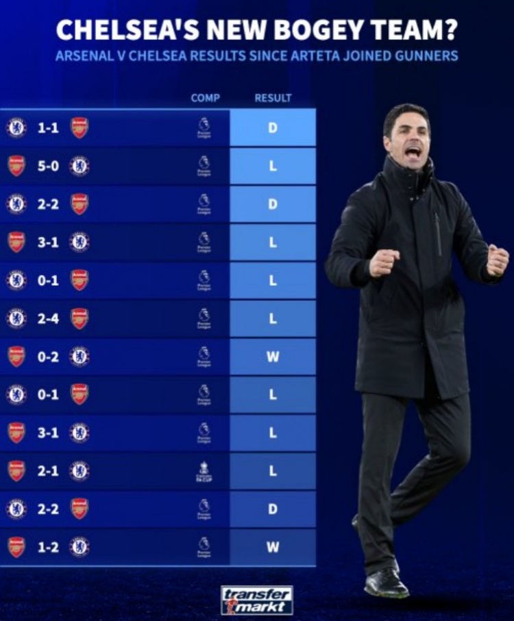 自阿爾特塔執(zhí)教阿森納12次對陣切爾西只輸兩場,近6場4勝2平