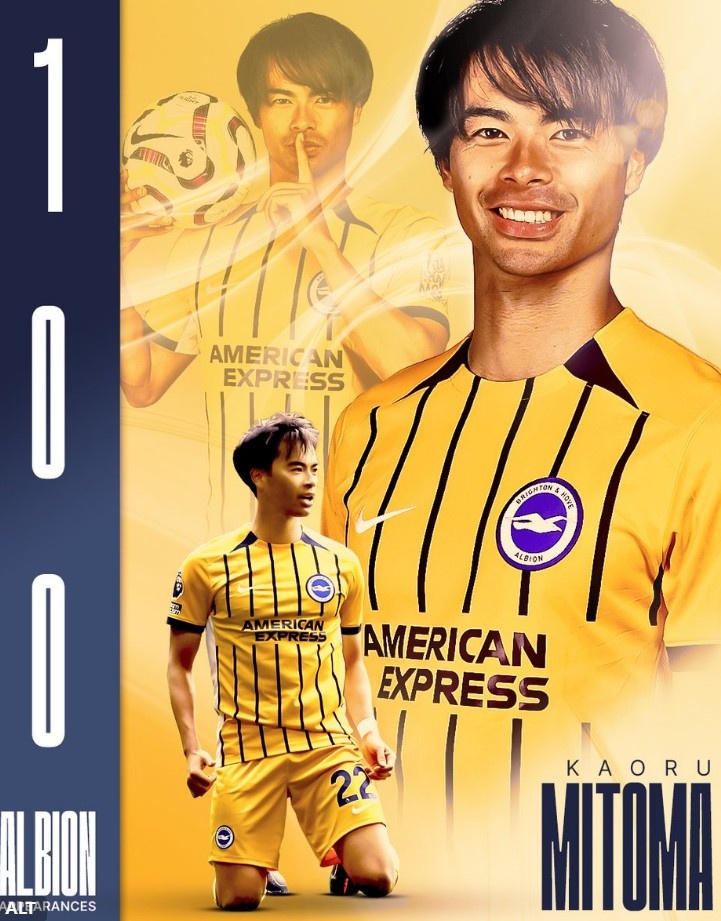 21球15助,布萊頓官方曬海報(bào)祝賀三笘薫達(dá)成100次出場(chǎng)里程碑