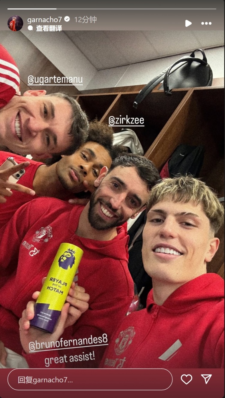 加納喬在社交媒體上曬出與B費、齊爾克澤、烏加特賽后的更衣室合照,他手拿B費的全場最佳獎杯,配文:“很棒的助攻。”