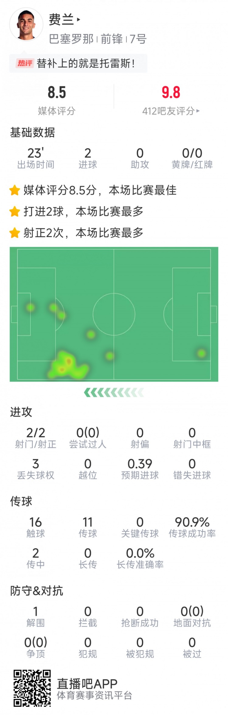 今天是托雷斯!費(fèi)蘭本場數(shù)據(jù):登場23分鐘梅開二度,僅用2次射門
