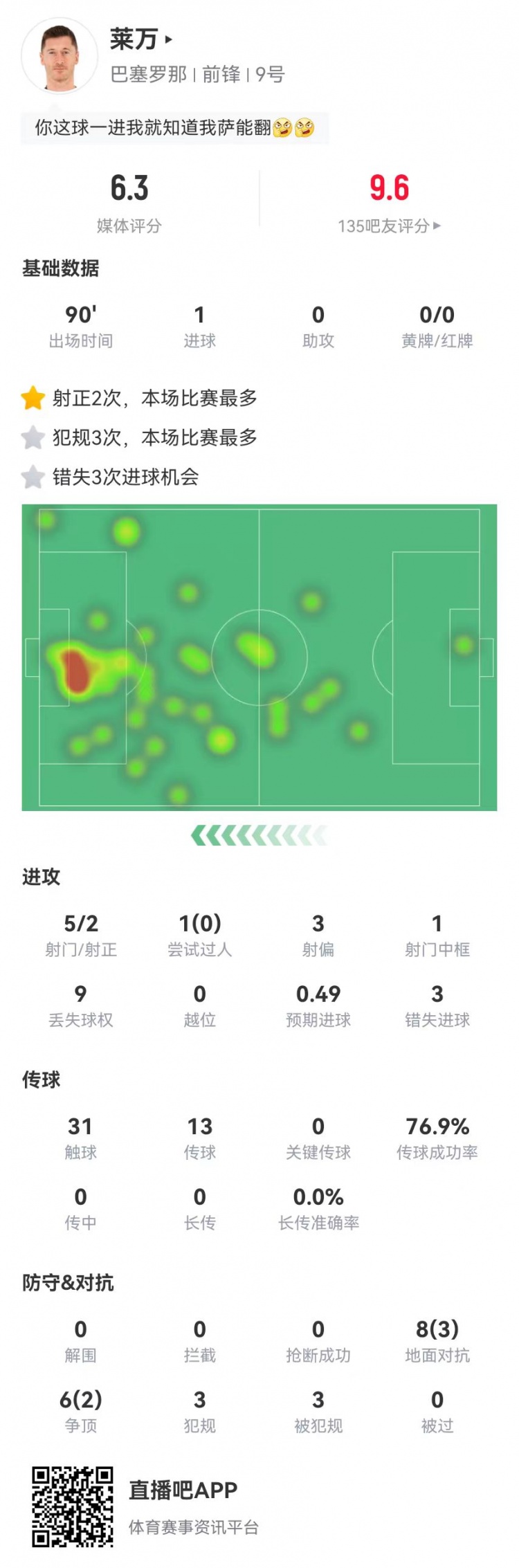 萊萬本場5射2正 1球3失良機 14對抗5成功 3犯規(guī)3造犯規(guī) 僅獲6.3分