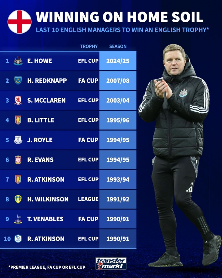 紐卡主帥埃迪-豪成為07-08賽季之后首位贏得國內(nèi)賽事冠軍的英格蘭主帥,上位做到這點(diǎn)的是哈里-雷德克納普。