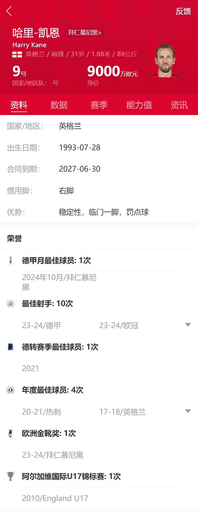 現(xiàn)年31歲的凱恩職業(yè)生涯攻入400多粒進(jìn)球、斬獲數(shù)十項個人榮譽(yù),但至今還未隨球隊奪得過主要賽事冠軍。