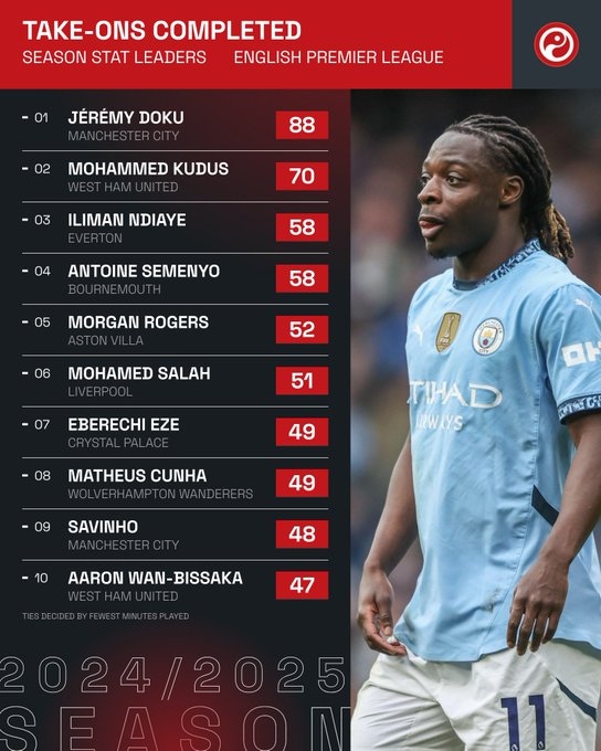 3月18日訊 曼城在本輪英超2-2戰(zhàn)平布萊頓,多庫單場13次成功過人。squakwa也統(tǒng)計了本賽季英超成功過人榜,多庫獨自領跑。