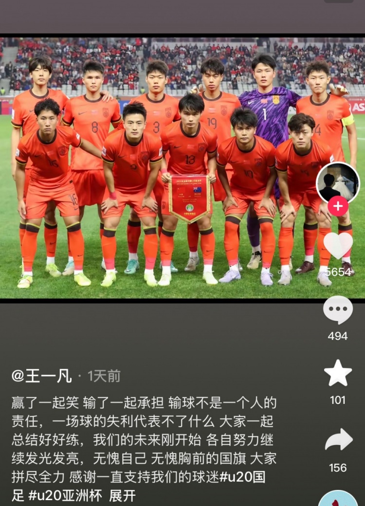 2月24日訊 在國(guó)青0-1不敵沙特,遺憾無(wú)緣世青賽后,國(guó)青球員王一凡更新社媒,表達(dá)了自己參加這屆U20亞洲杯的感受。