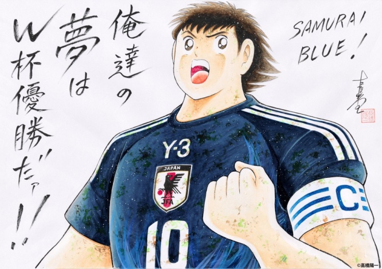 日本隊(duì)官推曬出了一張由《足球小將》作者高橋陽一手繪的大空翼海報(bào),文字內(nèi)容為:“藍(lán)武士!我們的夢想是世界杯冠軍!”