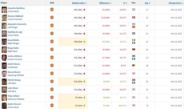 3月18日訊 德轉更新了部分英超球員身價,在此次更新中有13位曼聯(lián)球員身價發(fā)生了變化,其中9人出現(xiàn)下跌,4人出現(xiàn)上漲。