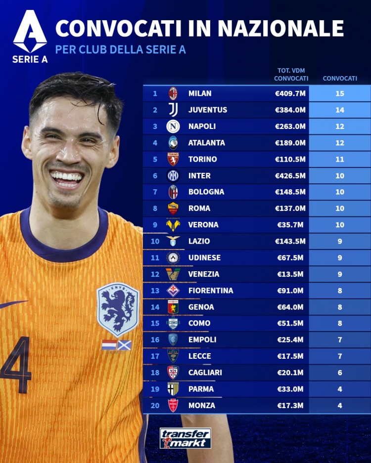 3月18日訊 德國轉(zhuǎn)會市場統(tǒng)計了意甲俱樂部被國家隊征召的球員人數(shù),并列出榜單,米蘭15人最多,尤文14人次席。