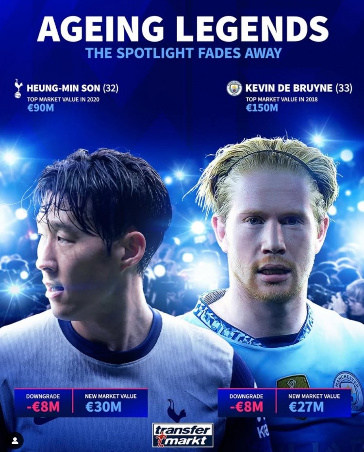 3月19日訊 《轉(zhuǎn)會(huì)市場(chǎng)》已經(jīng)更新了英超球員身價(jià),兩位老將孫興慜和德布勞內(nèi)各下降800萬(wàn)歐元。