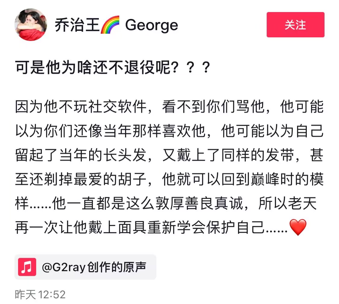 因?yàn)樗煌嫔缃卉浖?,看不到你們罵他,他可能以為你們還像當(dāng)年那樣喜歡他,他可能以為自己留起了當(dāng)年的長頭發(fā),又戴上了同樣的發(fā)帶,甚至還剃掉最愛的胡子,他就可以回到巔峰時的模樣…… 他一直都是這么敦厚善良真誠,所以老天再一次讓他戴上面具重新學(xué)會保護(hù)自己……?