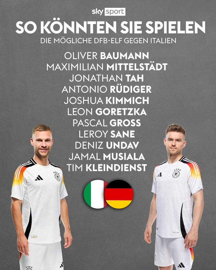 德天空預(yù)測德國隊(duì)首發(fā)如下:鮑曼、米特爾施塔特、若納坦-塔、呂迪格、基米希、格雷茨卡、格羅斯、薩內(nèi)、翁達(dá)夫、穆西亞拉、克萊因丁斯特