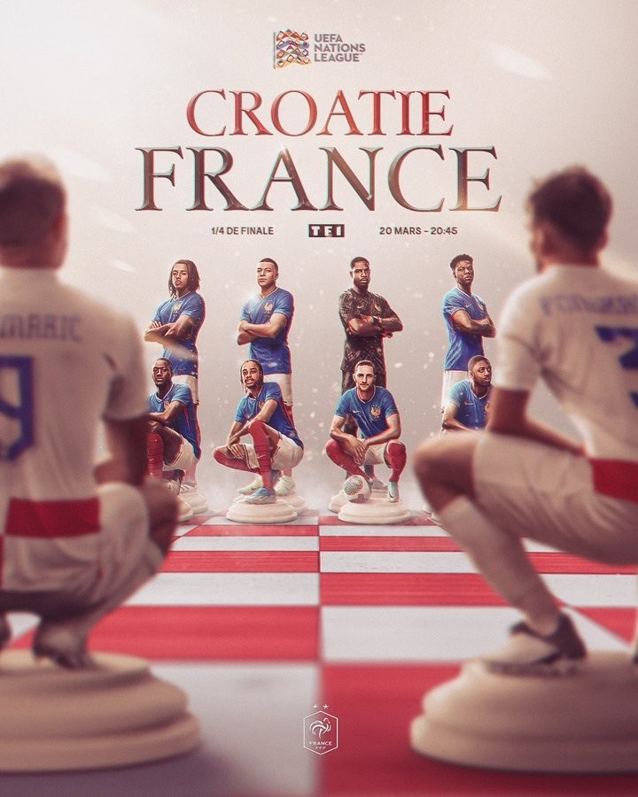 3月20日訊 北京時間3月21日星期五凌晨3點45分,法國將在歐國聯(lián)1/4賽決賽首回合客場挑戰(zhàn)克羅地亞,法國隊官方今天曬出了海報,為比賽預熱。
