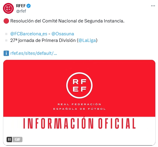 西足協(xié)表示,巴薩和奧薩蘇納均已損害競技利益的理由進(jìn)行上訴。但國家隊征召不構(gòu)成改期充分理由,只要俱樂部有足夠球員參賽即可。而巴薩和奧薩蘇納提議的日期均附加條件(如歐冠出局),可能引發(fā)賽程不確定性,違反賽程的“確定性原則”。考慮到奧薩蘇納vs畢爾巴鄂和vs巴薩的比賽僅相隔1天,西足協(xié)同意將奧薩蘇納vs畢爾巴鄂的比賽從28日改至30日。