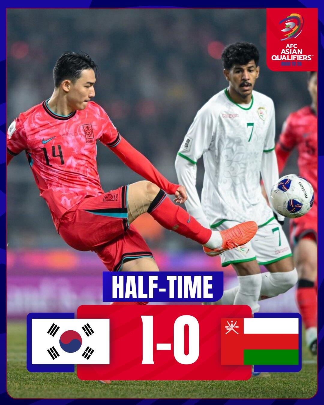 半場戰(zhàn)罷,韓國隊(duì)暫1-0阿曼隊(duì)。