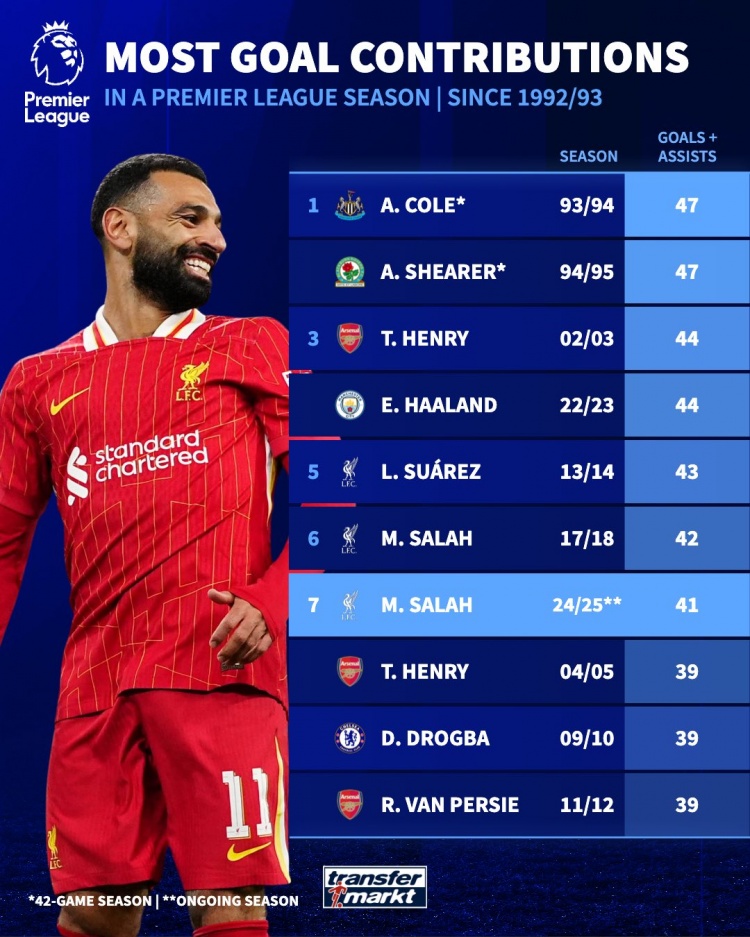 7、薩拉赫——41(2024-25賽季,賽季未結(jié)束)