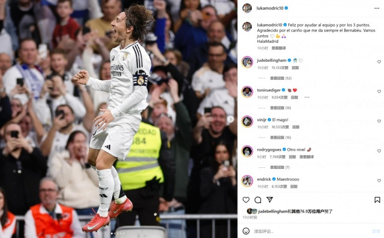 賽后莫德里奇也在個人社媒曬出慶祝進球的照片,配文寫道:“非常高興能夠幫助球隊全取三分,也感謝球迷們在伯納烏球場營造出的熱烈氛圍,讓我們一同前進!”