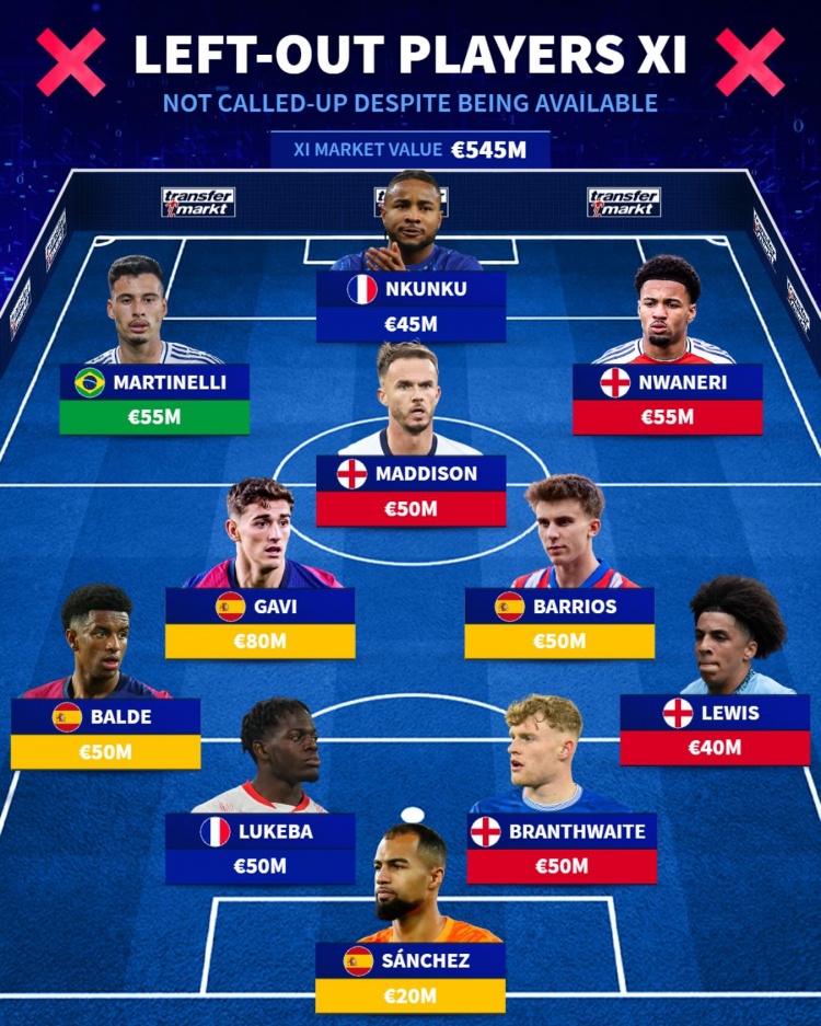 落選國(guó)家隊(duì)陣容(總價(jià)5.45億歐,不包含傷缺球員):