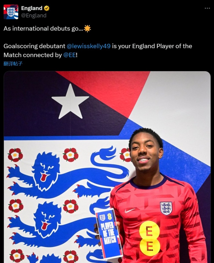 英格蘭隊官方也在賽后宣布,首秀破門的小將斯凱利被英格蘭球迷票選為本場比賽隊內(nèi)最佳球員。