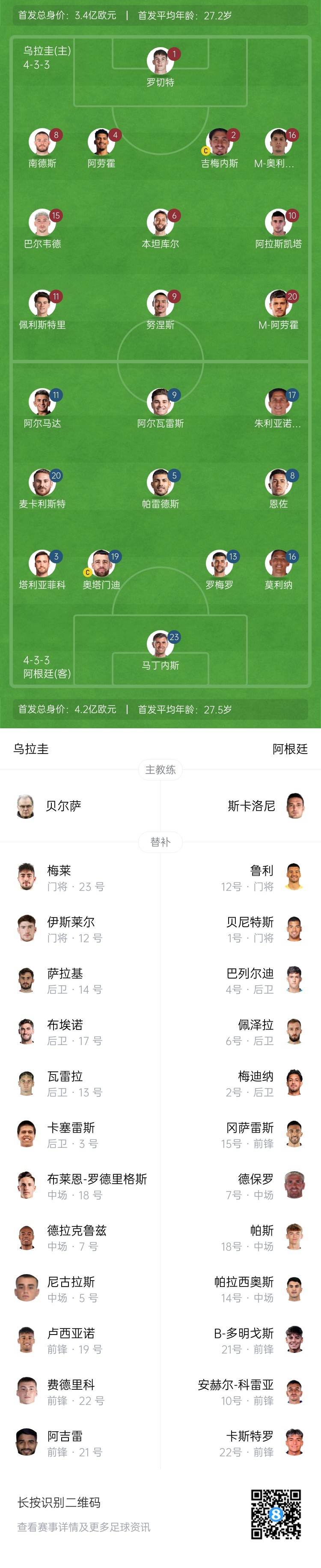 阿根廷替補:12-魯利、1-瓦爾特-貝尼特斯、2-梅迪納、4-巴列爾迪、6-佩澤拉、7-德保羅、10-科雷亞、14-帕拉西奧斯、15-尼古拉斯-岡薩雷斯、18-帕斯、21-多明戈斯、22-卡斯特羅