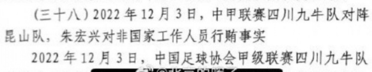 2022年12月3日,中甲聯(lián)賽四川九牛隊(duì)對(duì)陣?yán)ド疥?duì),朱宏興對(duì)非國家工作人員行賄事實(shí)。