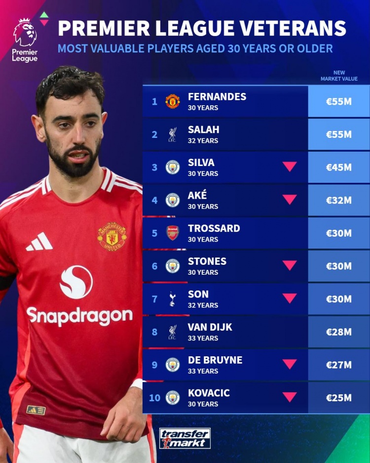 英超年齡30+球員德轉身價排名: