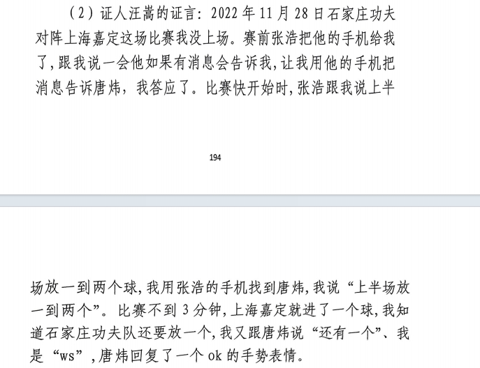 汪嵩證言:2022年11月28日石家莊功夫?qū)﹃嚿虾<味ㄟ@場比賽我沒上場。賽前張浩把他的手機(jī)給我了,跟我說一會他如果有消息會告訴我,讓我用他的手機(jī)把消息告訴唐煒,我答應(yīng)了。比賽快開始時(shí),張浩跟我說上半場放一到兩個(gè)球,我用張浩的手機(jī)找到唐煒,我說“上半場放一到兩個(gè)”。比賽不到3分鐘,上海嘉定就進(jìn)了一個(gè)球,我知道石家莊功夫隊(duì)還要放一個(gè),我又跟唐煒說“還有一個(gè)”,我是“ws”,唐煒回復(fù)了一個(gè)ok的手勢表情。