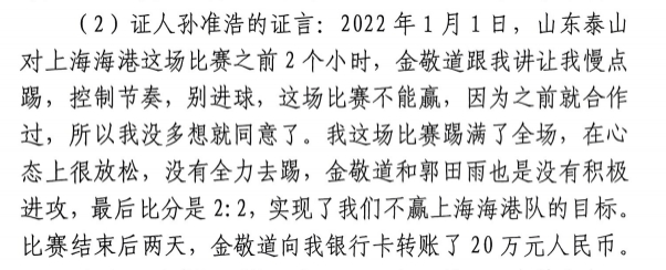 其中孫準(zhǔn)浩的證言為:“2022年1月1日,山東泰山對上海海港這場比賽之前2個小時,金敬道跟我講讓我慢點踢,控制節(jié)奏,別進球,這場比賽不能贏,因為之前就合作過,所以我沒多想就同意了。我這場比賽踢滿了全場,在心態(tài)上很放松,沒有全力去踢,金敬道和郭田雨也是沒有積極進攻,最后比分是2:2,實現(xiàn)了我們不贏上海海港隊的目標(biāo)。 比賽結(jié)束后兩天,金敬道向我銀行卡轉(zhuǎn)賬了20萬元人民幣?!?/p>