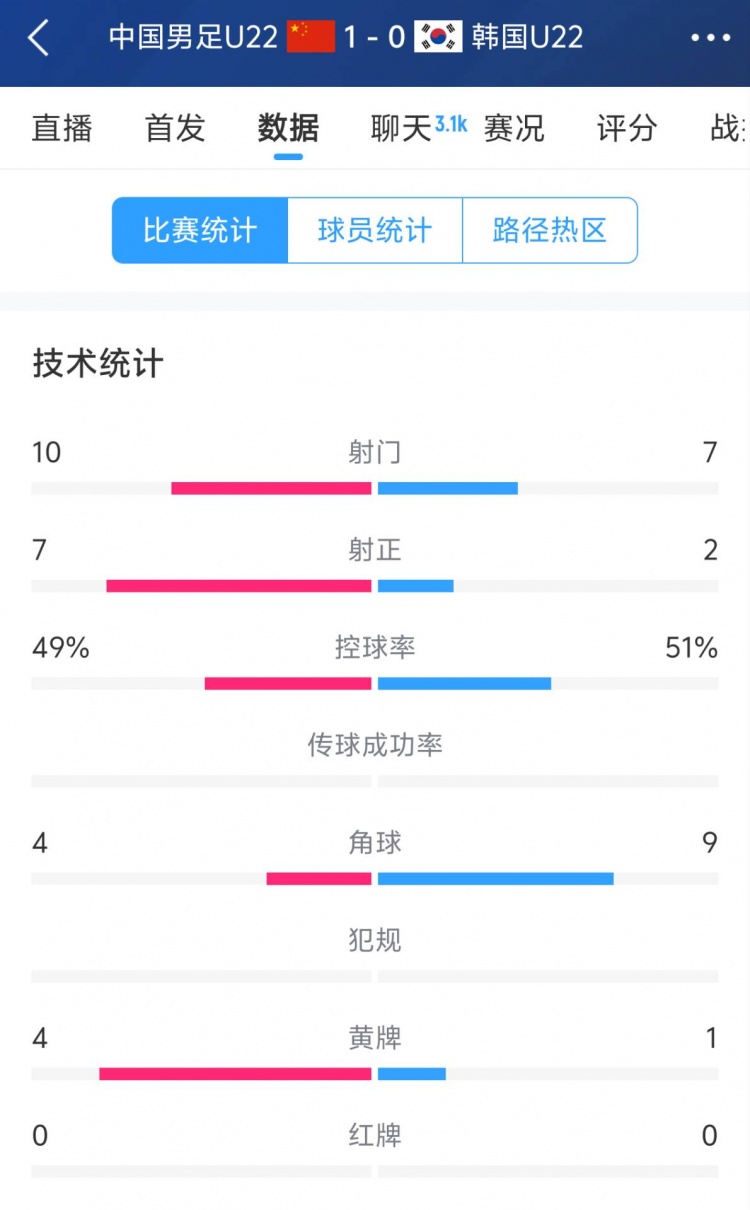 U22國足1-0韓國全場數(shù)據(jù):控球率49%落后韓國,10射7正領(lǐng)先對手