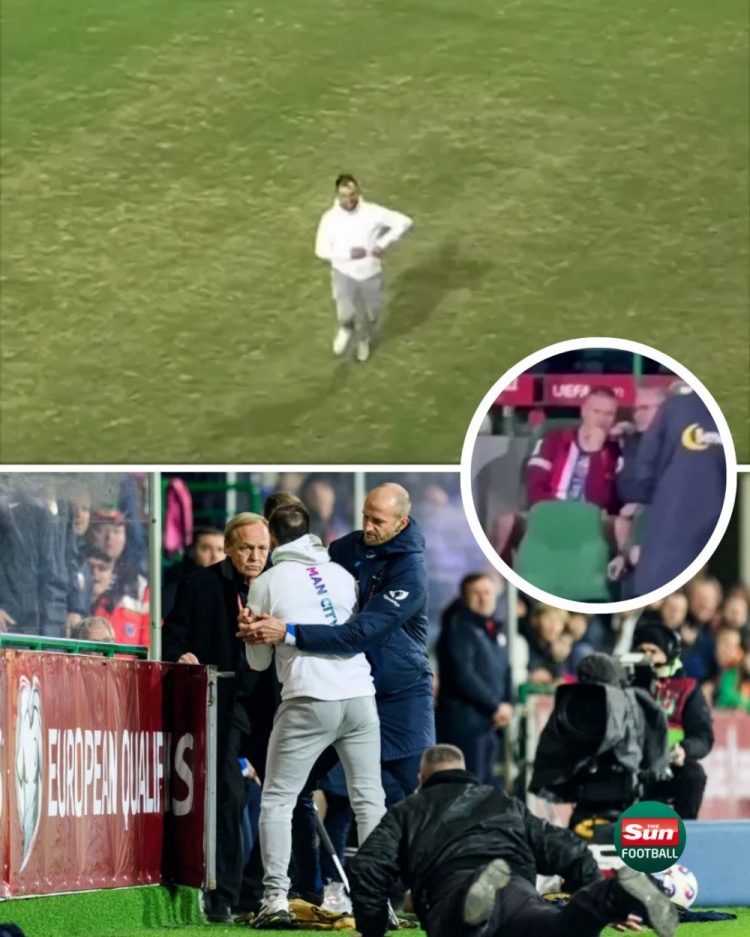 3月24日訊 據(jù)《太陽報》報道,在挪威隊5-0大勝摩爾多瓦的比賽中,一名球迷沖入球場找哈蘭德。