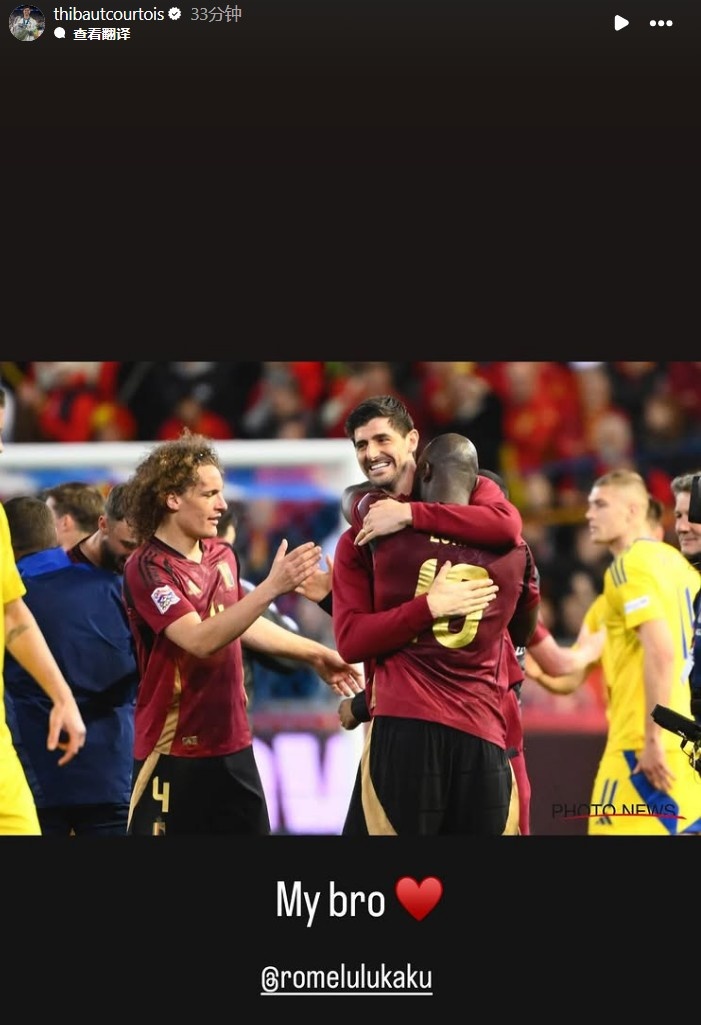 本場(chǎng)比賽,盧卡庫(kù)貢獻(xiàn)了梅開(kāi)二度,賽后庫(kù)爾圖瓦曬照并寫(xiě)道:“我的兄弟??@盧卡庫(kù)”