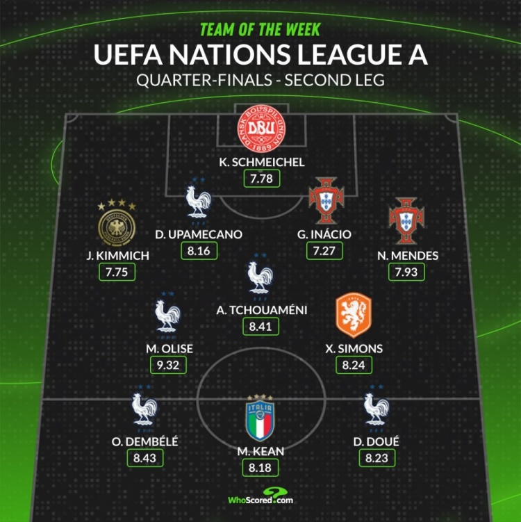 3月24日訊 歐國(guó)聯(lián)八強(qiáng)戰(zhàn)次回合已經(jīng)完賽,whoscored也統(tǒng)計(jì)了本輪評(píng)分最佳陣容,法國(guó)隊(duì)5將在列。