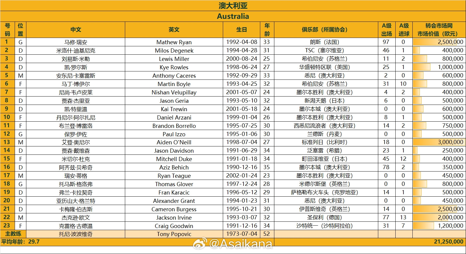 總身價(jià):中國(guó)1145萬(wàn)歐元,澳大利亞2125萬(wàn)歐元。
