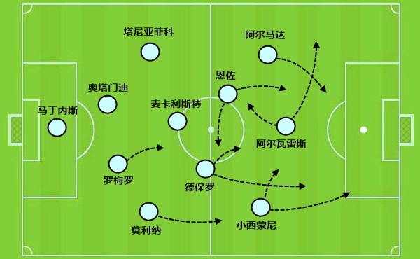 通過他的大范圍跑動,不只是回撤還要拉邊,帶來頻繁的換位。恩佐在前腰位置同樣有著大量的跑動,給阿爾馬達內(nèi)切或者是小西蒙尼前插帶來機會。