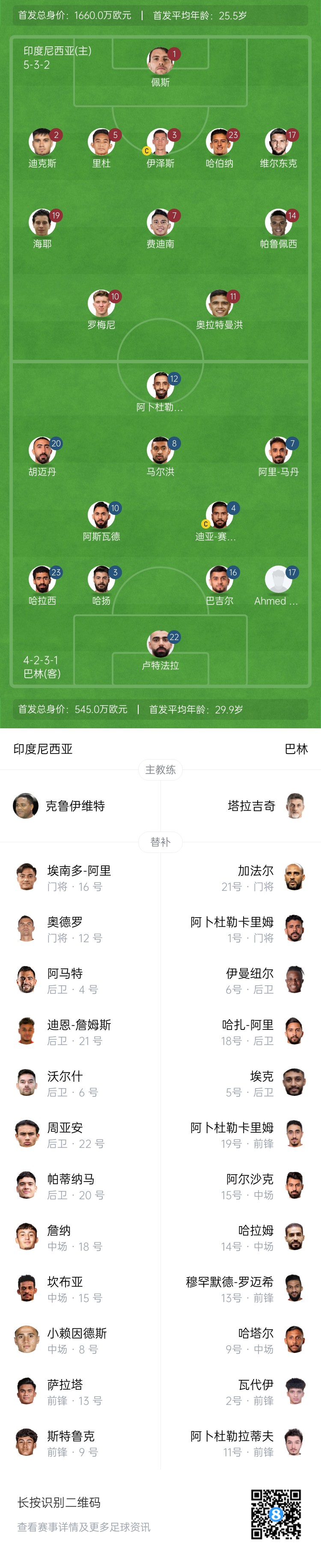 印尼替補(bǔ):12-奧德羅、16-埃南多-阿里、4-阿馬特、21-迪恩-詹姆斯、6-沃爾什、22-周亞安、20-帕蒂納馬、18-詹納、15-坎布亞、8-小賴因德斯、13-薩拉特、9-斯特魯克