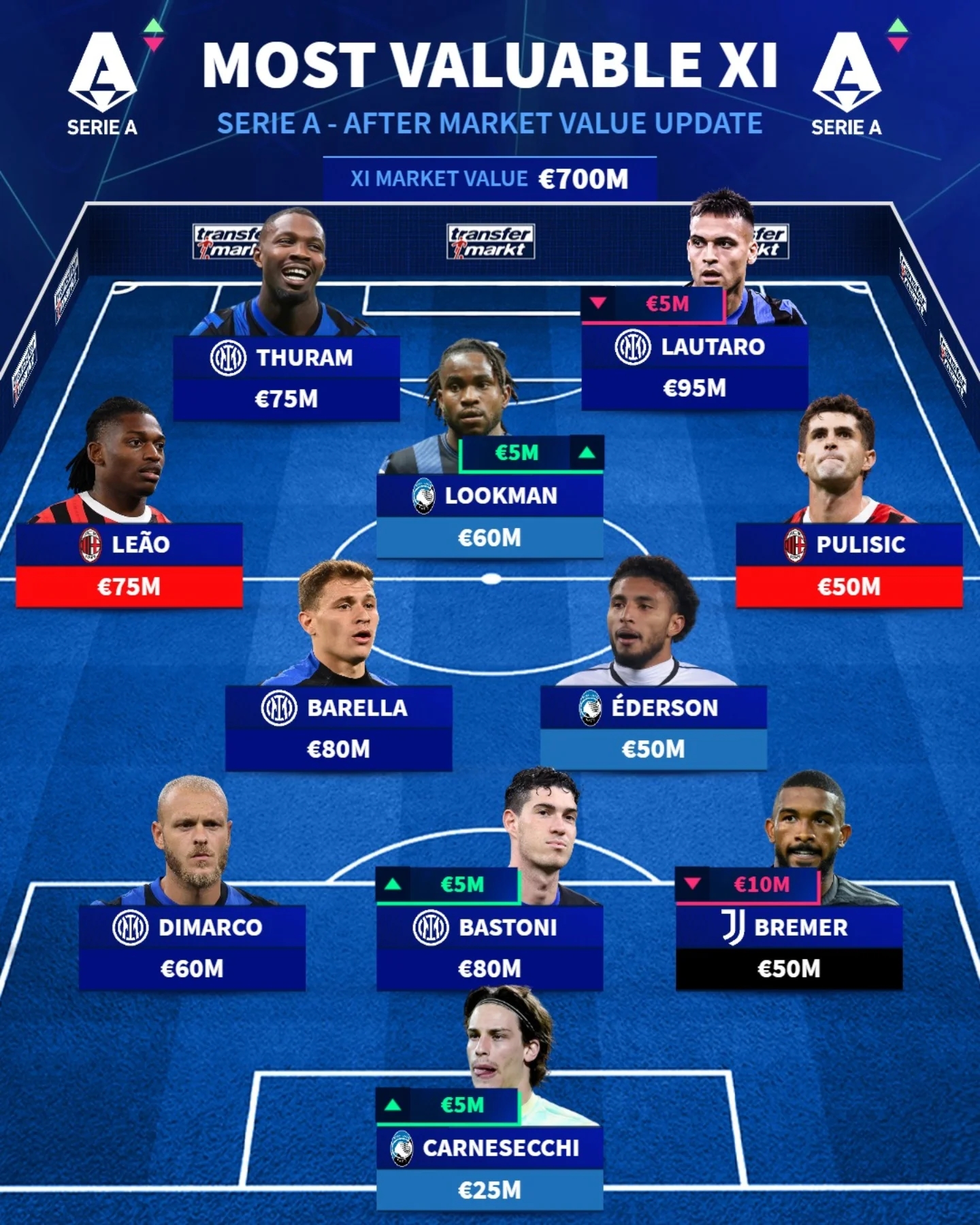 3月26日訊 德轉(zhuǎn)更新了意甲球員身價(jià),并列出了該聯(lián)賽最貴身價(jià)陣容,國(guó)米5人,亞特蘭大3人,米蘭2人,尤文后衛(wèi)布雷默在列。