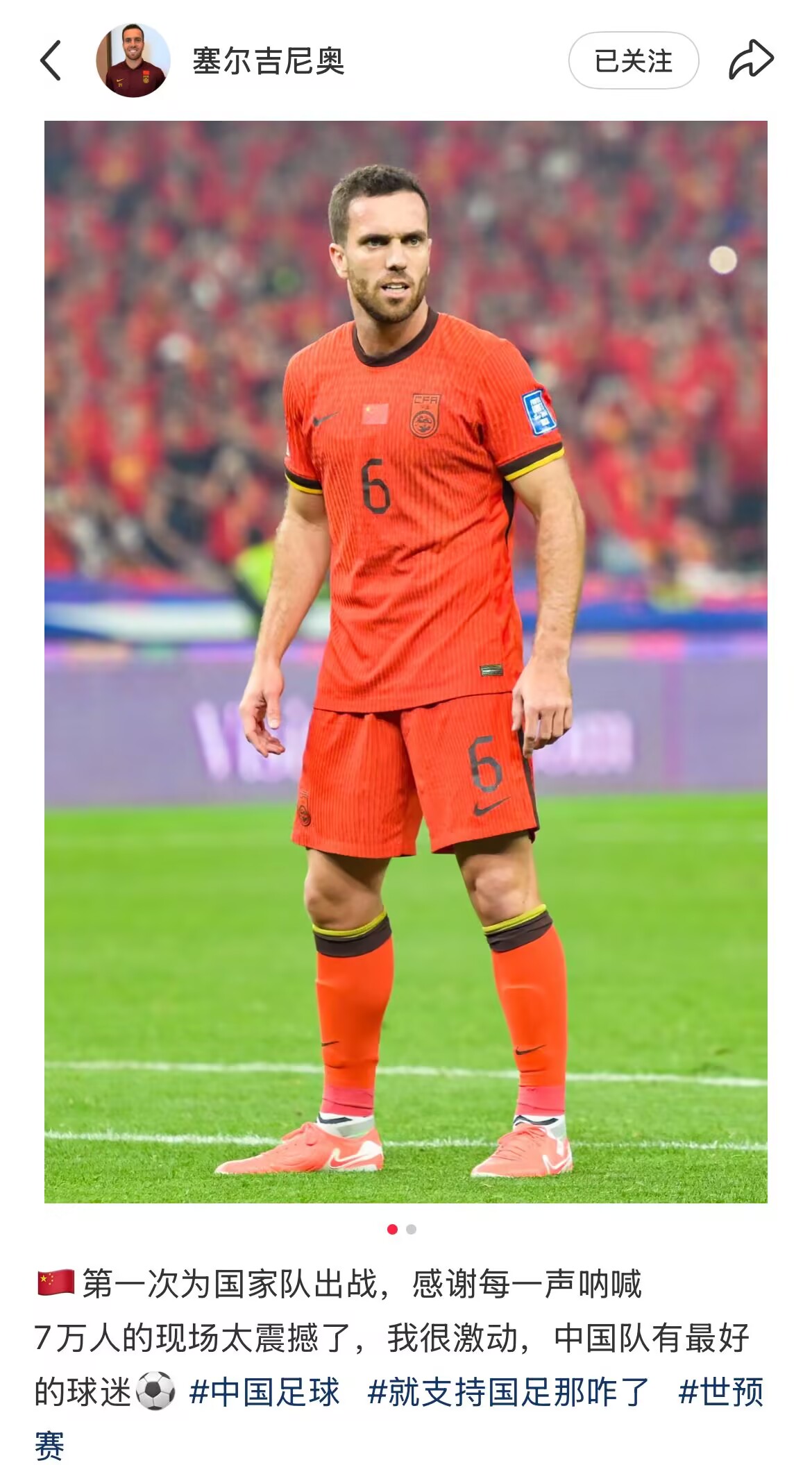 塞爾吉尼奧:“第一次為國家隊出戰(zhàn),感謝每一聲吶喊。7萬人的現(xiàn)場太震撼了,我很激動,中國隊有最好的球迷?!?/p>