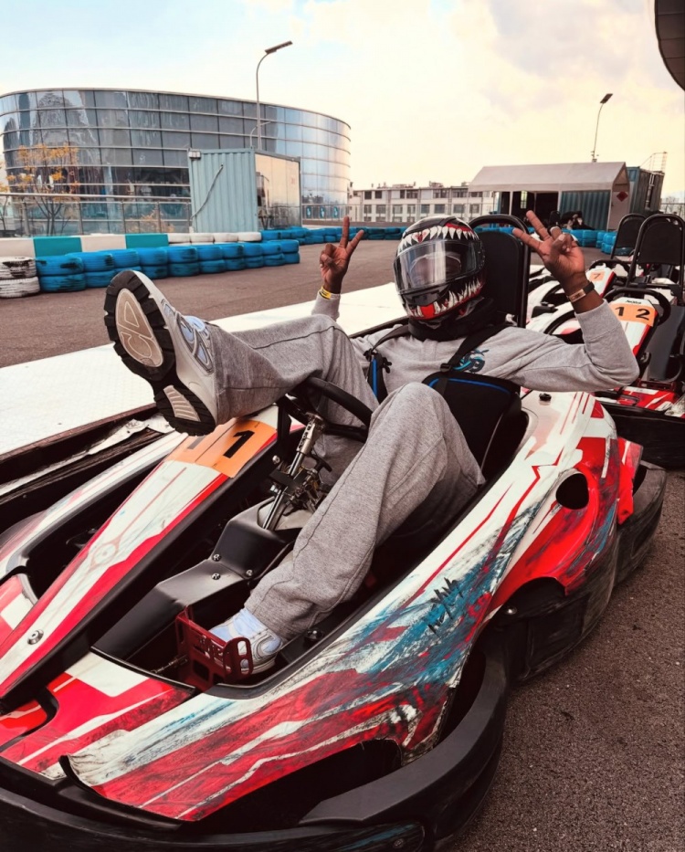 各種pose擺個(gè)不停,小奧斯卡社媒曬與賽車合影