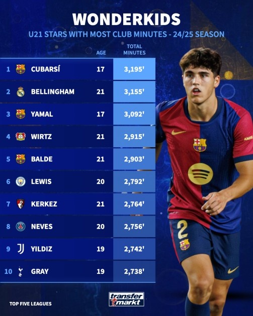 3月26日訊 根據(jù)德轉(zhuǎn)統(tǒng)計(jì),庫巴西是本賽季出場時間最多的U21球員,達(dá)到3195分鐘,貝林厄姆、亞馬爾分居二三位。