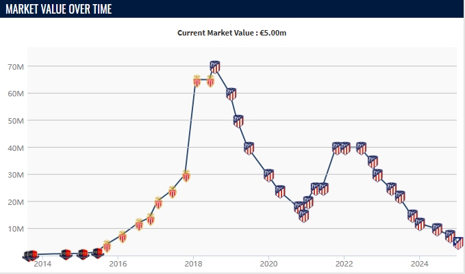 但在高價加盟馬競之后,勒馬爾的效率直線下滑,他也頻繁受到傷病困擾,身價一路走低,從巔峰時期的7000萬歐,掉到現(xiàn)在的500萬。