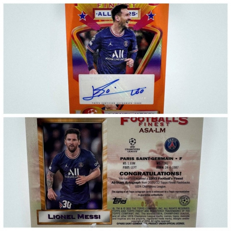 這張2021-22賽季Topps Finest Flashbacks UEFA Champions League Football’s Finest全明星簽名橙折射卡,全球僅印制10張。正面小字標(biāo)注著“Topps認(rèn)證簽名版本”。卡片背面還提供了更多保證:“所有Topps簽名卡的簽署過程均有Topps代表現(xiàn)場監(jiān)督,確保真實(shí)性?!边@張卡片潛在價(jià)值超過1000美元。