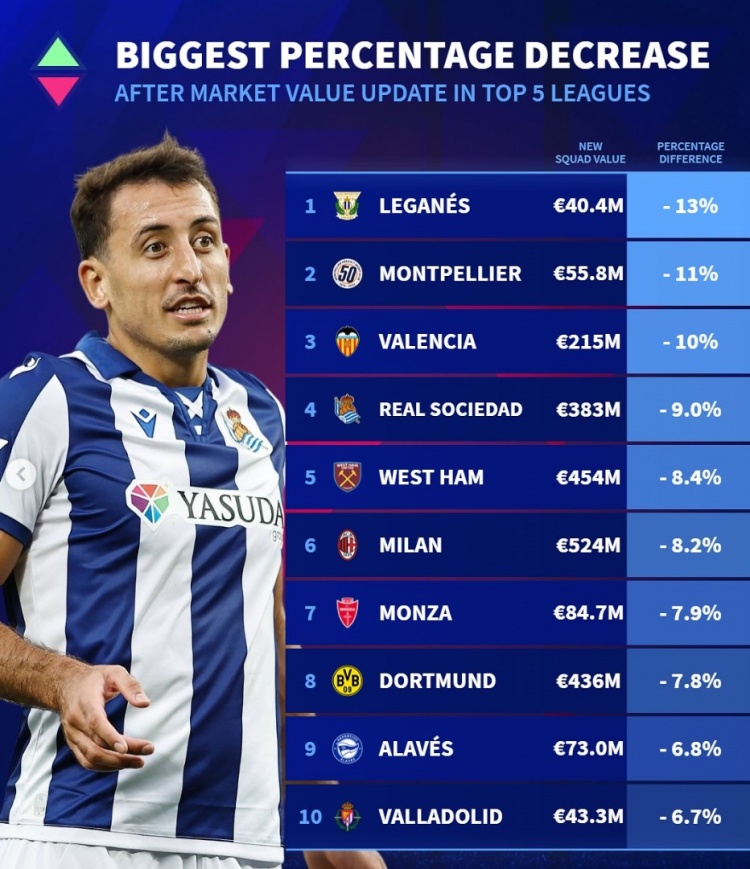 五大聯(lián)賽球隊(duì)身價(jià)貶值比例最高榜:歐元