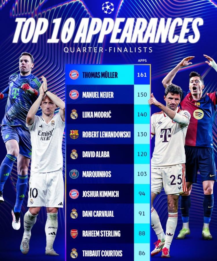 3月28日訊 本賽季歐冠8強已經(jīng)全部誕生,分別為阿森納、皇馬、巴黎圣日耳曼、維拉、巴薩、多特、拜仁以及國米。歐足聯(lián)官方統(tǒng)計了8強中出戰(zhàn)歐冠比賽場次最多的球員top10,穆勒以161場居首,諾伊爾150場位居次席。