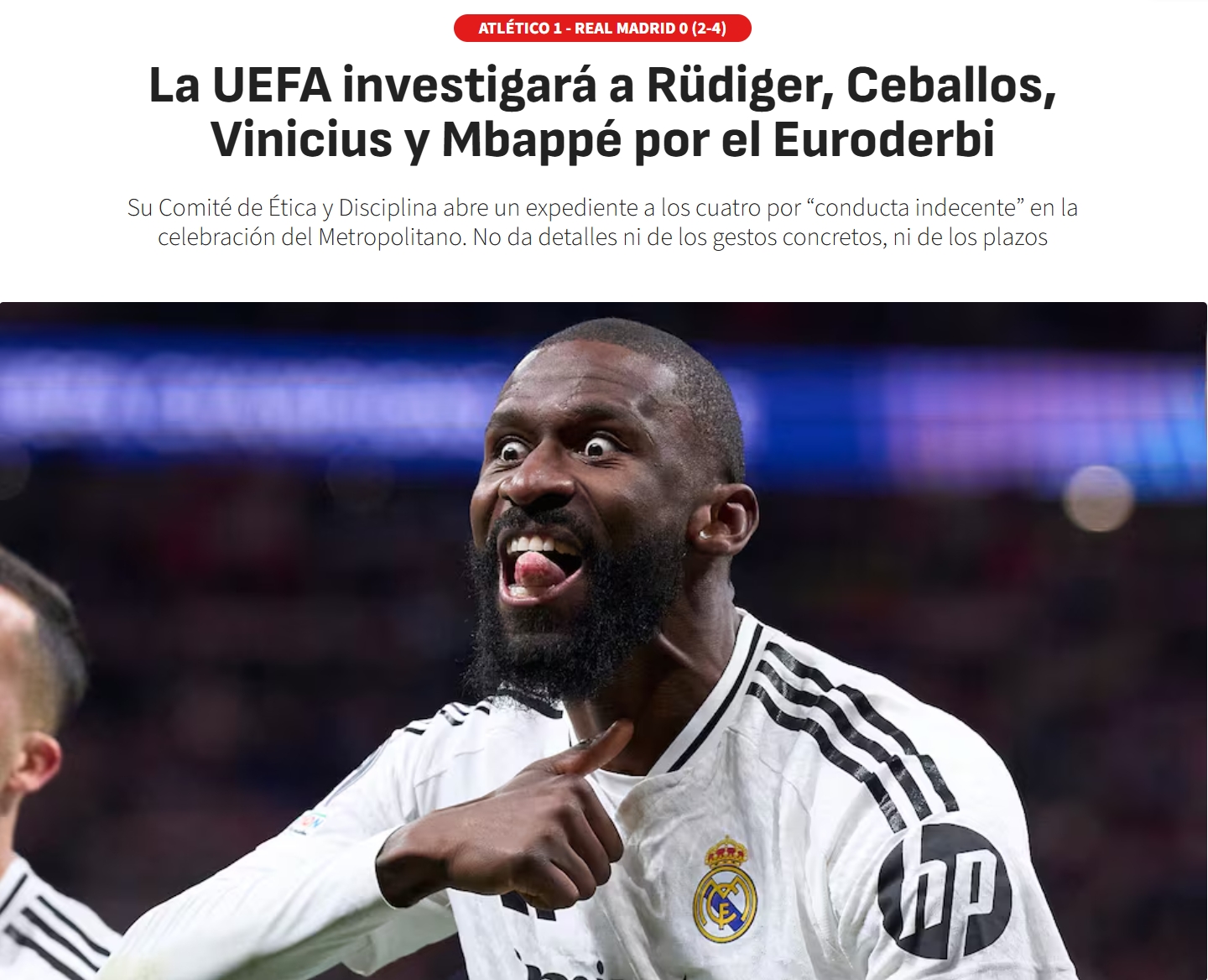 03月28日訊 歐足聯(lián)官方昨日發(fā)布官方公告,宣布對姆巴佩、維尼修斯、呂迪格、塞巴略斯4名皇馬球員在歐冠對馬競賽后的不當行為展開進一步調(diào)查。《阿斯報》透露了皇馬俱樂部方面對此的立場。