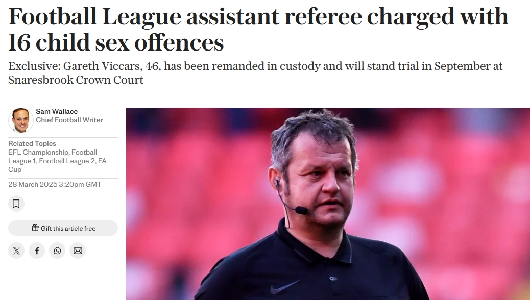 46歲的加雷斯·維卡斯是一名邊裁,自2018年以來還被選為足總杯和聯(lián)賽杯比賽的官員,他被控12項(xiàng)與兒童發(fā)生性行為的罪名。此外,他還被控兩項(xiàng)與兒童進(jìn)行性交流的罪名;一項(xiàng)在性誘導(dǎo)后與兒童會面的罪名;以及一項(xiàng)在兒童面前從事性行為的罪名。