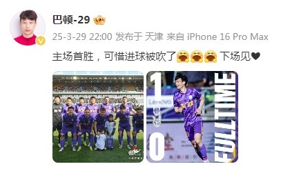 3月29日訊 在中超聯(lián)賽第3輪中,天津津門虎1-0戰(zhàn)勝青島海牛,本場比賽也是天津津門虎本賽季的主場首勝。賽后津門虎主力巴頓更新微博表示“主場首勝,可惜進球被吹了”,同時他也不忘向球迷預告“下場見”。