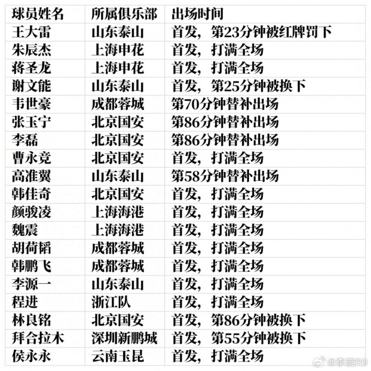 李璇在個(gè)人微博中寫道:參考國(guó)家隊(duì)1月份的集訓(xùn)名單,統(tǒng)計(jì)了一下2025賽季中超首輪國(guó)腳的出場(chǎng)情況,圖為有出場(chǎng)記錄的球員,未出場(chǎng)球員(共13人,費(fèi)南多因不在中超聯(lián)賽可忽略不計(jì)):蹇韜、楊澤翔、吾米提江-玉蘇普、吳少聰、徐皓陽(yáng)、汪海健、王上源、黃政宇、買烏郎-米吉提、王子銘、楊立瑜、陶強(qiáng)龍、費(fèi)南多。